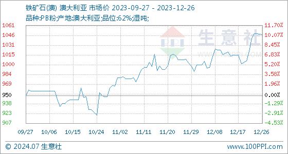 12月26日,生意社铁矿石(澳)基准价为1048.56元/吨,与本月初(988.89元/吨)相比,上涨了6.03%。